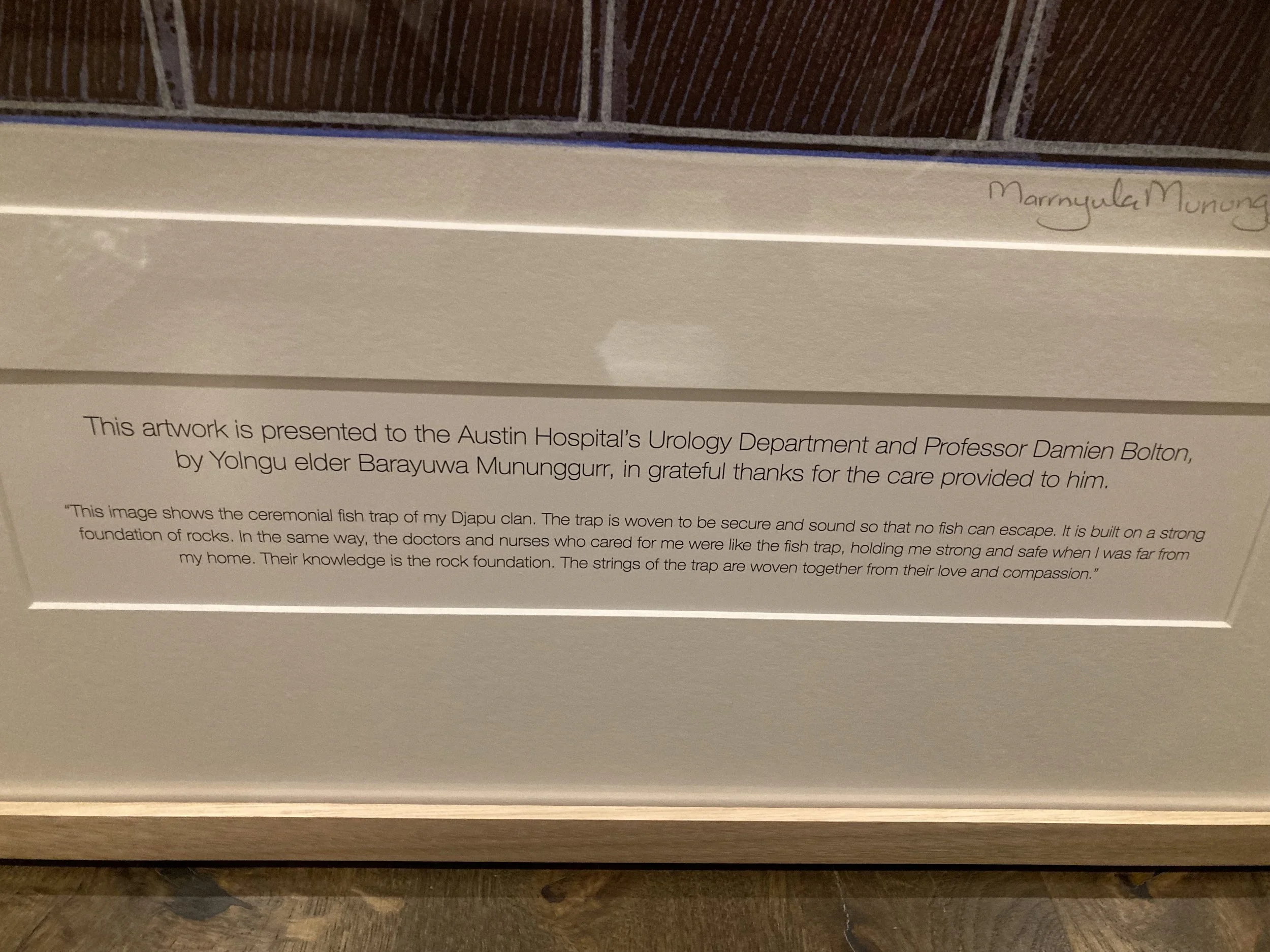 “This image shows the ceremonial fish of my Djapu Clan. The trap is woven to be secure and sound so that no fish can escape. It is built on a strong foundation of rocks. In the same way, the doctors and nurses who cared for me were like the fish trap, holding me strong and safe when I was far from my home. Their knowledge is the rock foundation. The strings of the trap are woven together from their love and compassion.”